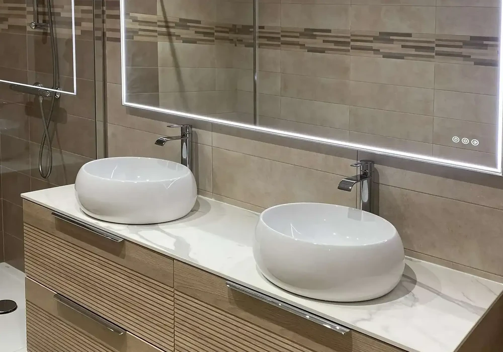 Conception et installation de mobilier sur mesure avec vasques intégrées alliant rangements optimisés et design contemporain.