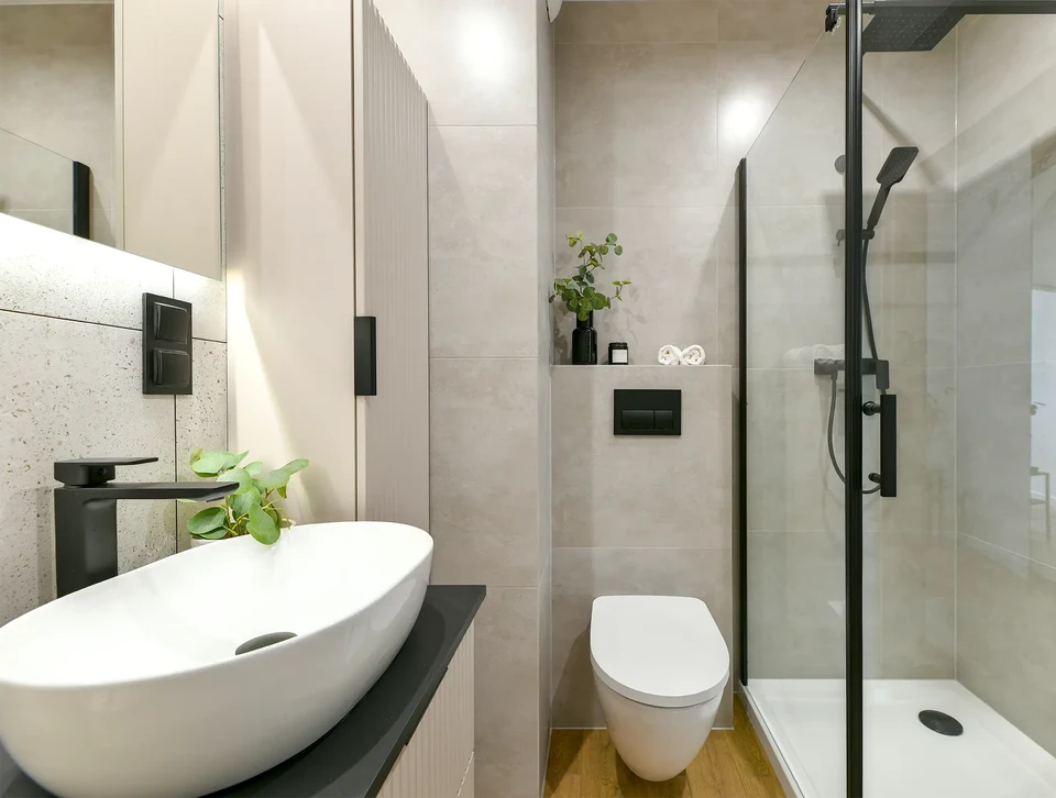 Installation de WC suspendus, lavabos design et robinetterie moderne à économie d'eau pour une salle d'eau fonctionnelle.
